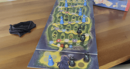 The goal of the game is for four apprentices to reach Balduin the magician before three witches do. However, we overlooked this tidbit in the instructions. We blindly assumed that we wouldn’t win until we’d gotten all six apprentices down to the valley before the witches. Not important. It didn’t affect how we played.