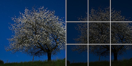 Bei der Komposition des Bildes helfen der «Goldene Schnitt» oder auch die «Drittel-Regel» weiter. Bei der Drittel-Regel wird das Bild gedanklich in neun gleiche Teile geschnitten. Man zieht zwei waagerechte und zwei senkrechte Linien, sodass alle neun Teile gleich gross sind. Das zu fotografierende Motiv wird an einem der vier Schnittpunkte oder längs an einer Linie platziert.