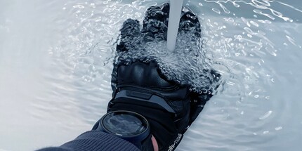 Dort, wo der Wind auf den Handschuh trifft, findest du dicken Stoff, isolierte Polster oder Leder. Isoliert ist mit Solto Tex, also zweilagig. Das hält Wind auch bei 225 km/h auf der deutschen Autobahn ab. Spannenderweise hat es während der 500-Kilometer-Testfahrt nie länger als ein paar Minuten geregnet. Deshalb: Labortest mit Wasser. Und mit Labor meine ich «Badezimmer» sowie «Küche». Zuerst halte ich den Handschuh unter das laufende Wasser, was mir nach einer Minute zu langweilig wird. Dann versenke ich meine Hand ganz im Lavabo, was nach fünf Minuten immer noch keine nassen Finger bringt.
