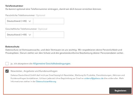 Dann registriere dich als Galaxus-Kunde. Folge dafür diesem Link. Setzte bei der Registrierung den Haken bei Newsletter, Angebote und Kundenumfrage.