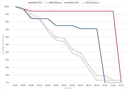 Beinahe zeitgleich takten beide Laptops nach zwei Minuten auf 97 Prozent CPU-Auslastung herunter. Nach rund sechs Minuten kommt der nächste Sprung. Der AMD-Prozessor drosselt auf eine Range von 92 bis 96 Prozent, wo er den gesamten Test verweilt. Die Intel-CPU drosselt auf 81 bis 86 Prozent und fällt danach noch zweimal. Nach 40 Minuten auf 73 bis 77 Prozent und nach 65 Minuten auf 68 bis 74 Prozent. Nach 1 Stunde und 29 Minuten geht bei Intel der Saft aus. Bei AMD nach 1 Stunde und 36 Minuten.