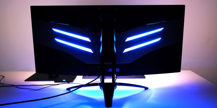 Das Design des Agon ist schnörkellos. Viel zu bestaunen gibt es nicht. Der Rand ist weder besonders schmal noch besitzt er unnötige Fettpölsterchen. Für die unter euch, die sich bei meinem letzten Testgerät an den vielen Lichtlein gestört haben, denen muss ich leider mitteilen, dass auch der Agon nicht vom LED-Trend gefeit ist. Immerhin nicht im gleichen Ausmass. Am unteren Displayrand sowie auf der Rückseite findest du ein paar LED-Streifen, die wahlweise in rot, blau oder grün leuchten. Die Funktion ist standardmässig deaktiviert und lässt sich über das OSD-Menü steuern.
