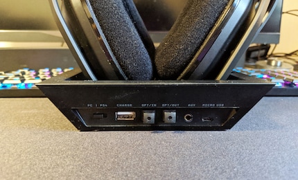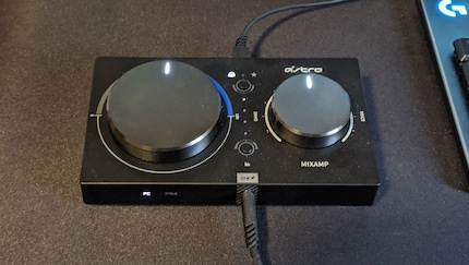 Astro hat die Bedienung etwas intuitiver gestaltet. Du hast am A50 einen Schieberegler, um die Kopfhörer ein- und auszuschalten. Daneben gibt es zwei Tasten für den Equalizer und für den Surround Sound. Alles wird dir mit Audiosignalen quittiert. Die drei Equalizer-Profile Astro, Studio und Pro kannst du dank einem, zwei, oder drei Signaltönen leicht unterscheiden. Und sonst siehst du es nun auch auf der Anzeige der mitgelieferten Dockingstation in Form von Zahlen. Ein Lautstärkeregler ist ebenfalls wieder mit an Bord. Für die Feinjustierung zwischen Gamesound und Voicechat drückst du die rechte Ohrmuschel vorne oder hinten. Damit passt du das Tonverhältnis an. Beim A40 musst du das über das MixAmp-Böxchen machen. Das ist umständlich, dafür sieht das Teil stylisch aus.