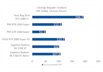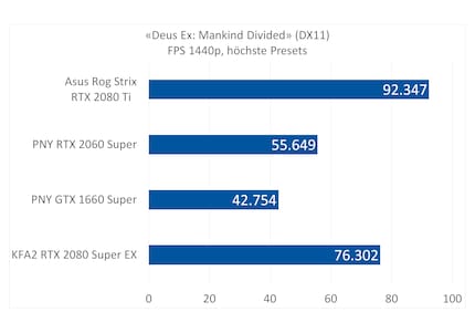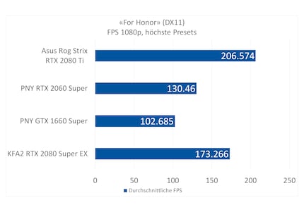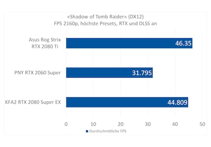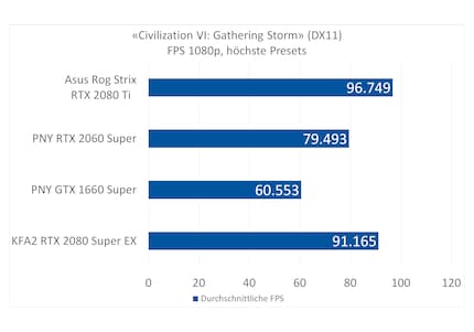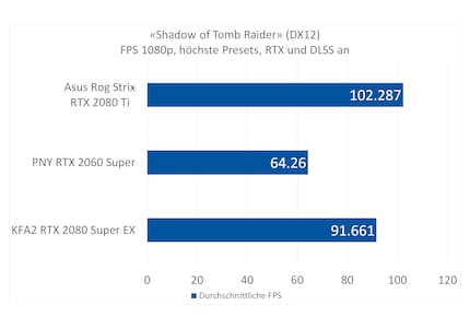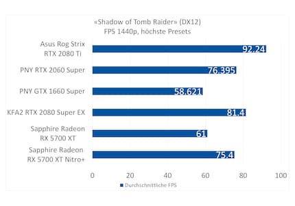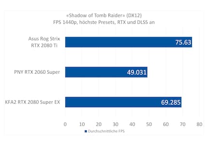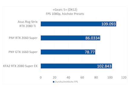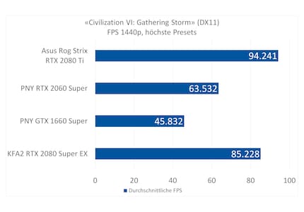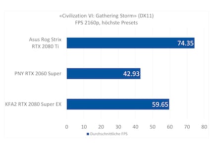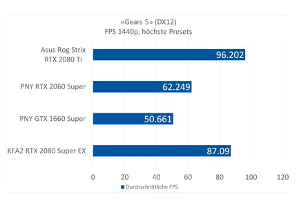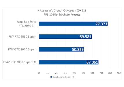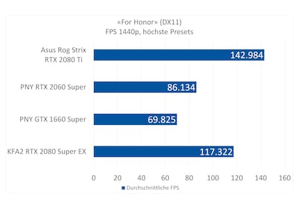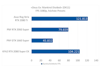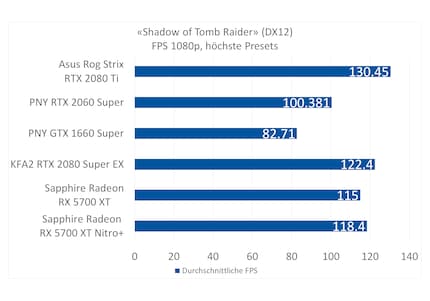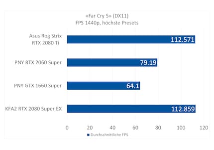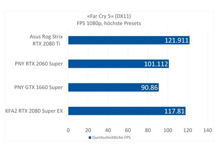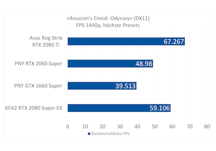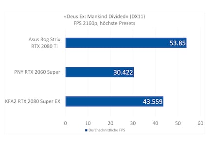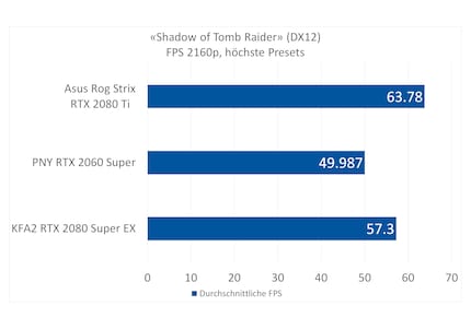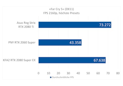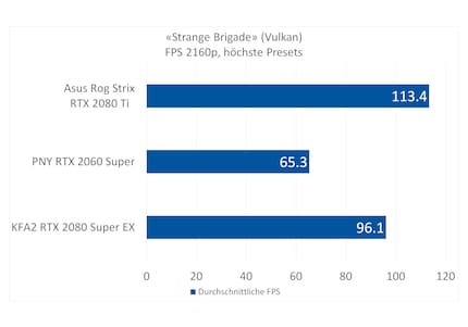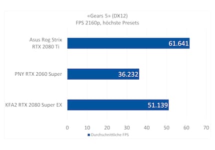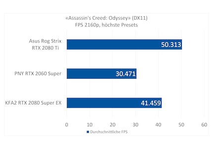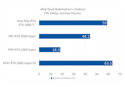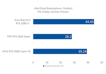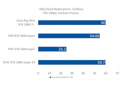 ROG steht für «Republic of Gamers». Genau dafür ist die Karte gemacht: zum Gamen. Die 2080 Ti setzt sich hier ganz klar an die Spitze. Es reicht aber nicht in allen Spielen für ein flüssiges 2160p-Erlebnis. Mit ein paar Abstrichen bei den Einstellungen, sollte aber auch ein «Red Dead Redemption» mit 60 fps spielbar sein.