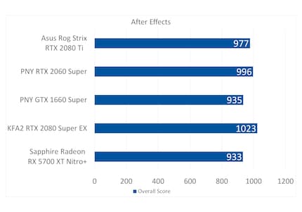 Erstaunlich: Die 2080 Ti liegt hinter der 2080 Super und gar der 2060 Super. Es kann tatsächlich sein, dass die Karte in unserem Testsetting in den Adobe-Anwendungen nicht so schnell ist, wie sie es sein sollte. Es kann aber auch sein, dass die Adobe-Anwendungen ab einer gewissen Leistungsfähigkeit der Grafikkarten weniger auf einen Leistungsunterschied ansprechen.