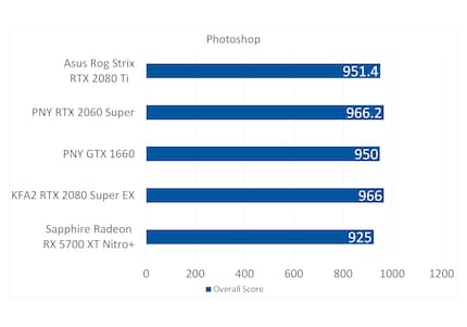 Die 2080 Ti schlägt sich im Photoshop-Benchmark nicht so gut, wie ich erwartet hätte. Die 2080 Super erreicht einen höheren Score. Eventuell skaliert die 2080 Ti in unserer Testbench nicht so gut. Beim GPU Score liegt sie an zweiter Stelle hinter der 2080 Super. Der Unterschied ist mit anderthalb Prozent nicht riesig.