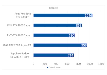 Bei Resolve hat die 2080 Ti eindeutig die Nase vorne: Sie distanziert die 2080 Super um zehn Prozentpunkte.