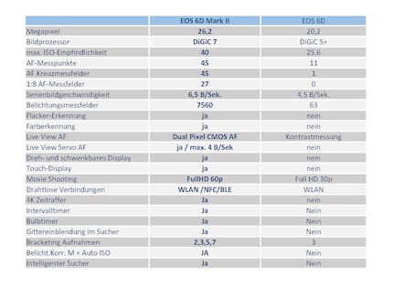Hier siehst du, was Canon bei der 6D Mark II im Vergleich zum Vorgängermodell verbessert hat.Das könnte dich auch interessieren