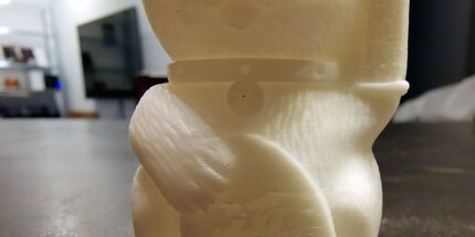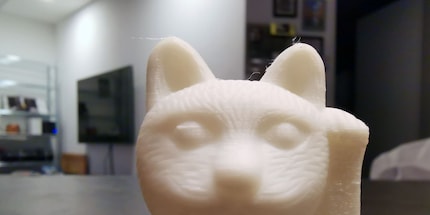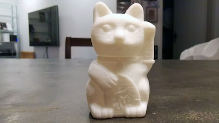 Nach etwa dreieinhalb Stunden ist die mit 0.1 Millimeter Schichtdicke gedruckte Katze fertig. Die Druckqualität überzeugt mich für den ersten Druck vollends. Ohne gross etwas einzustellen, sieht die Katze super aus. Dank der Schichtdicke von 0.1 Millimeter sind die Layer kaum erkennbar. Bei den Ohren hat es einige Fäden, das sogenannte Stringing, gegeben. Das passiert, wenn der Druckkopf grössere Distanzen ohne zu drucken überwinden muss. Hier muss ich künftig noch etwas an den Einstellungen feilen. Nichts desto trotz: Für den ersten Druck sieht’s super aus.