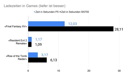 Bei den Benchmarks ist der Unterschied zwischen den SSDs nicht gross. Das ändert sich bei den Ladezeiten der Games. Hier lässt die P5 die SN750 bei zwei Games weit hinter sich.