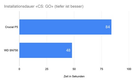 Überzeugen kann die P5 vor allem bei den Ladezeiten von Games. Hier ist sie bis zu mehr als doppelt so schnell als die SN750. Bei Spielen mit langen Ladezeiten wie «Final Fantasy XV» macht das einen Unterschied. Beim Schreiben von grösseren Datenmengen bremst die SSD jedoch herunter. Das zeigt nicht nur die Installation von «CS: GO», sondern auch das Kopieren der zwei Filme.