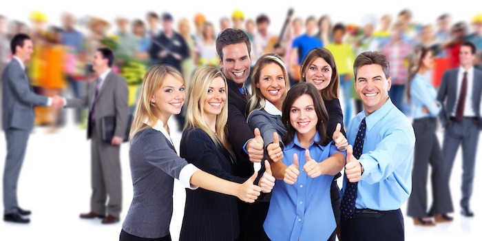 Schöne und glückliche Menschen sitzen an einem Tisch und halten ein Meeting ab. Jemand in einem hellblauen Hemd zeigt irgendwo hin, wo es nichts zu sehen gibt. Die anderen schauen sehr interessiert ins Leere. Die Personen wirken alle sehr sauber, fast schon steril, und bilden einen politisch korrekten Mix aus Mann und Frau, alt und jung, hell- und dunkelhäutig.