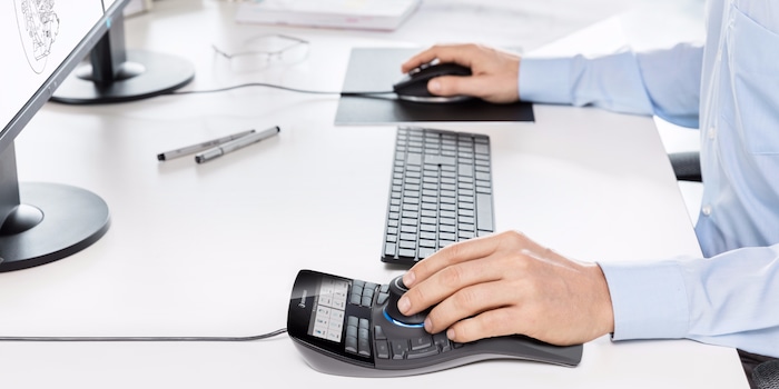 In der rechten Hand hältst du mit der CadMouse ein Präzisionswerkzeug, das mit sinnvollen Features wie der dedizierten, mittleren Maustaste, dem intelligenten Mausrad oder der QuickZoom-Funktion speziell für das Arbeiten in 3D- und CAD-Umgebungen entwickelt wurde.