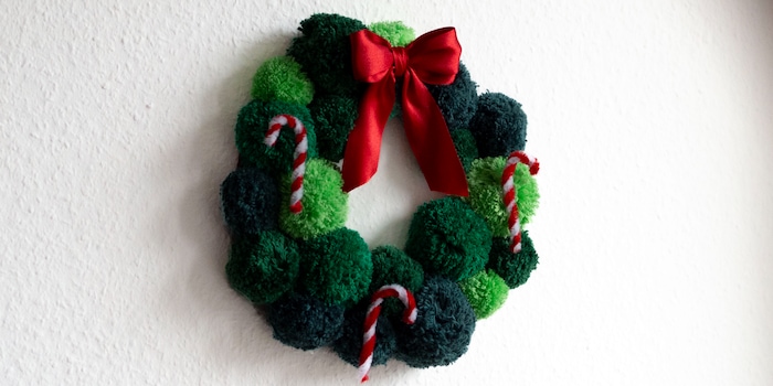 Der Kranz wirkt wie ein weiches, flauschiges Moos und fühlt sich ebenso an. Um ihm eine weihnachtliche Note zu verleihen, fehlen noch passende Verzierungen. Dafür zwirbel ich Pfeifenreiniger zu kleinen Zuckerstangen und bastle aus einem Dekoband kleine Schleifen. Du kannst auch kleine Weihnachtsornamente an den Kranz hängen oder eine Lichterkette um den Weihnachtskranz wickeln.