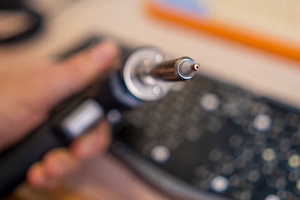 Bisher habe ich Lötstellen immer mit einer manuellen Entlötpumpe beseitigt. Das hat ganz gut funktioniert, was bei vielen Lötstellen wie bei einer Tastatur jedoch mühsam ist. Die Entlötstation macht die Arbeit definitiv leichter und schneller, da das Erhitzen und Absaugen mit ein und demselben Gerät passieren. Obwohl ich schneller bin mit der Station, lassen sich schwierige Lötstellen damit dennoch nicht einfacher entlöten als mit einer manuellen Entlötpumpe.