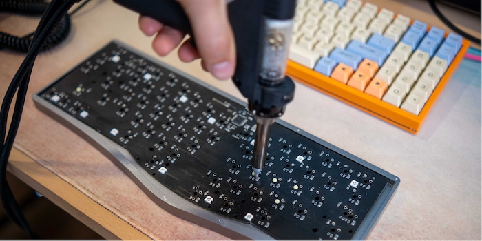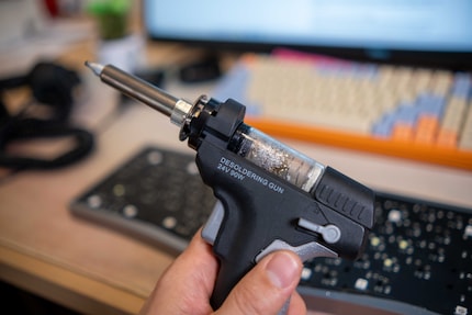 Kürzlich habe ich meine erste DIY-Tastatur einem Facelift unterzogen. Dabei habe ich auch die Taster getauscht. Da die Tastatur nicht über Hot Swap verfügt, musste ich alle Switches entlöten; mit einem Lötkolben und einer manuellen Entlötpumpe. Eine mühsame Arbeit, die mich für die 168 Switches über zweieinhalb Stunden Arbeit gekostet hat.