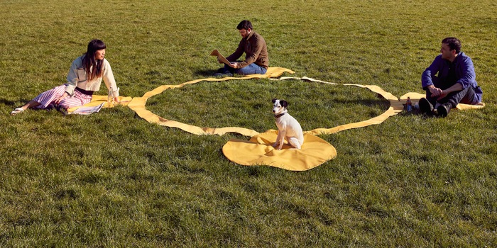 Die DIY-Decke «Here Comes The Sun» soll uns Social Distancing erleichtern. Sie ist so gestaltet, dass du und deine Mitmenschen zwei Meter voneinander entfernt zusammensitzen könnt.