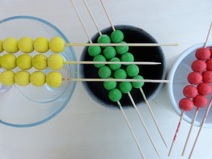 1. Fädle die Holzkugeln auf die Schaschlikstäbe. Male die Kugeln mit Pinsel und Fingerfarben (alternativ Acrylfarben) in drei Farben an. Pro Spiess eine Farbe. Lege die Kugeln samt Spiess anschliessend zum Trocknen auf einem Gefäss ab, sodass die Kugeln im Freien hängen.