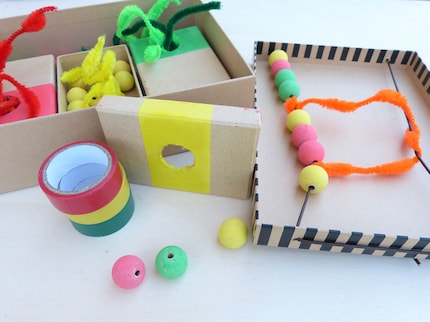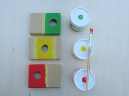 Alle anzeigen2. Die drei kleinen Kartonboxen werden zu Sortierboxen umfunktioniert, indem du in alle drei Deckel jeweils ein Loch in der Grösse der Holzkugeln schneidest. Zeichne mithilfe eines Zirkels die Kreise auf, stich mit einem spitzen Gegenstand (z.B. Cutter) den Rand aus, sodass du zum Schluss den Kreis durchdrücken kannst. Anschliessend klebst du links und rechts vom Loch mit einem Masking Tape eine Fläche ab, welche du mit der Fingerfarbe anmalen kannst. Lass die Farbe gut trocknen.