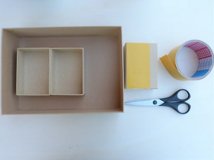 3. Sobald die Kartonboxen trocken sind, kannst du die Tapes entfernen. Bestimme, wo auf dem Boden der grossen Schachtel du die drei Boxen samt Deckel anbringen möchtest. Bringe dann auf dem Unterboden der grossen Schachtel den doppelten Klebestreifen an. Danach ziehst du die Folie ab und befestigst sie am Boden der grossen Schachtel.