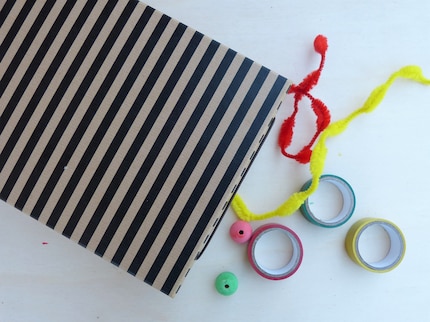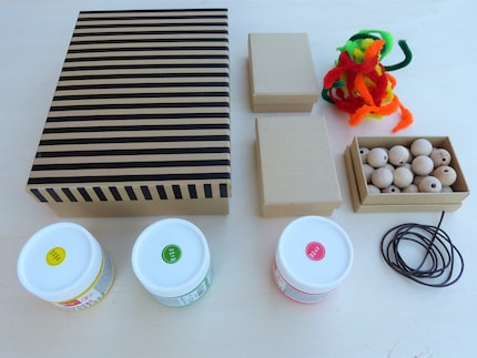 Die Grundlage für die Spielebox ist eine schlichte Kartonschachtel und drei rechteckige Kartonboxen, welche in der grossen Schachtel Platz haben. Um der Box Leben einzuhauchen, brauchst du ca. 45 Holzperlen (20 mm Durchmesser), drei verschiedene Fingerfarben, ein Lederband und optional Chenilledraht. Als Hilfsmittel benötigst du hohe Gefässe, lange Schaschlikstäbe, einen Cutter, Pinsel, Doppelklebestreifen, Bleistift, Masking Tape und einen Zirkel.