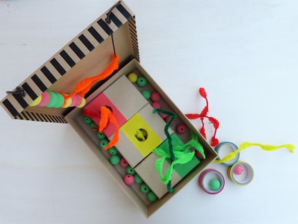 Im Sommer bin ich oft mit meiner Familie in der Badi. Meine kleinen Kinder wollen nonstop im Wasser bleiben, obwohl sie nach 15 Minuten zu frösteln beginnen. Damit ich sie nicht ständig mit einem Eis rauslocken muss, greife ich seit Neuestem auf eine selbst gebastelten Spielebox zurück. Damit können meine Kinder Holzkugeln nach Farben sortieren, Chenilledraht in verschiedene Formen biegen oder mit dem Lederband eine Kette basteln.