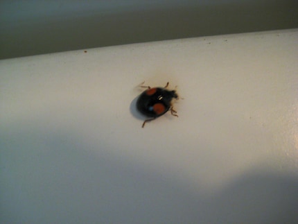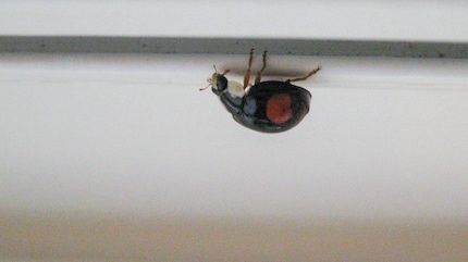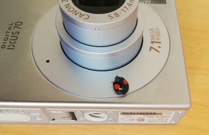 In meiner Küche ist ein Marienkäfer zu Gast. Ein umgekehrter Marienkäfer: Nicht rot mit schwarzen Punkten, sondern schwarz mit roten Punkten. Das ideale Opfer. Im Makromodus der Ixus 70 komme ich bis auf 4 cm heran. Das müsste reichen.
