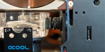 Den Loop der Wasserkühlung mache ich folgendermassen: Von der Pumpe geht’s direkt auf die Rückseite der Innenwand. Von dort führt eine Softtube auf eine weitere Schottverschraubung auf der Höhe des Einlass-Ports des CPU-Wasserblocks. Auf der Vorderseite geht’s auf den CPU-Block. Von dort geht’s zurück auf die Innenwand und auf deren Rückseite mit einer Softtube etwas nach rechts unten in eine Schottverschraubung. Auf der Vorderseite geht’s in den Radiator und von dort schliesslich ins Reservoir und die Pumpe.