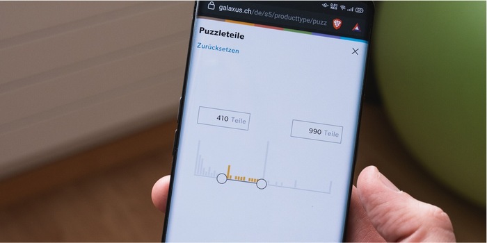 Du willst deine Tochter mit einem Puzzle überraschen, hast aber bei unseren über 500 Puzzles den Überblick verloren? Auch da greift dir unser Bereichsschieberegler unter die Arme und führt dich Schritt für Schritt zu einer geeigneten Auswahl. Als erstes schränkst du bei unseren Puzzles die Anzahl der Puzzleteile ein. Hier war uns wichtig, dass du in schönen Schritten auswählen kannst und dass die Schrittgröße dynamisch ansteigt. Die Skala des Filters Puzzleteile passt sich den vorhandenen Produktdaten an. Im Puzzlebeispiel werden zuerst 10er-Schritte und am Ende 10.000er-Schritte angezeigt. Dadurch wirkt die Skala kompakter und hat weniger unschöne Lücken im Verlauf.