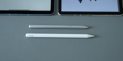 Als erstes fällt auf, dass der Stift für das Galaxy Tab kürzer, dünner und leichter ist als der Apple Pencil. Er liegt auch einiges schlechter in der Hand und fühlt sich etwas billig an. Dafür kostet er aber auch keinen Rappen extra, denn er ist im Lieferumfang enthalten. Für den Apple Pencil blätterst du rund 130 Franken hin, dafür bekommst du aber auch einen hochwertigen Stift, der sich hervorragend anfühlt. Beide Stifte werden kontaktlos geladen, indem du sie ans Tablet heftest. Die Dinger sind magnetisiert.