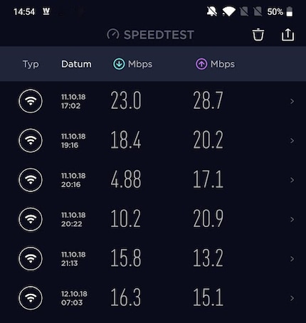 Als ich an mehreren Abenden Speedtests gemacht hatte, zeigt sich mir dann aber ein etwas anderes Bild. Die Geschwindigkeit variierte viel mehr, als ich erwartet habe.
