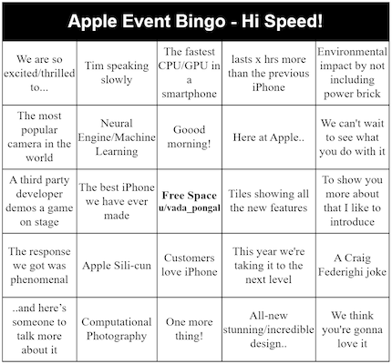 Alle anzeigenEndlich. Das neue iPhone ist hier. In einer aufgezeichneten Keynote hat Apple-CEO Tim Cook das neue Handy aus dem Hause Apple vorgestellt. Selbst wenn die Features drüben bei Android fortgeschrittener sein mögen und die Worte «Best Ever» tendenziell zu oft gefallen sind, das Phone verspricht viel. Daher hat Reddit User u/vada_pongal ein Keynote Bingo zum Mitspielen gemacht.