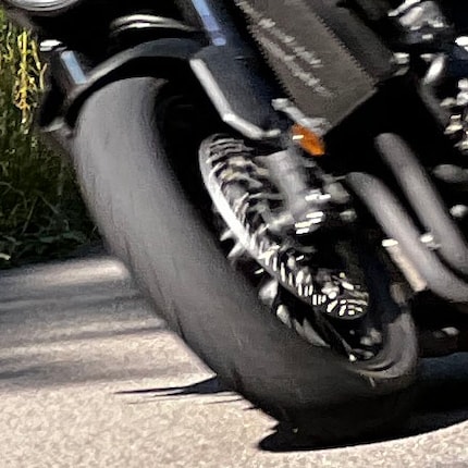 Obwohl in der Aufnahme die Verschlusszeit ein bisschen zu lang gewählt ist, zu erkennen an der glänzenden Bremsscheibe, die nicht gestochen scharf ist, bleibt der verbaute A15 Bionic cool. Im wahrsten Sinne des Wortes. Das iPhone 13 Pro Max wird nicht einmal warm trotz all den Anforderungen, mit denen es gerade zu kämpfen hat.