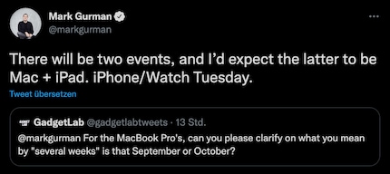 In seinem wöchentlichen Newsletter und einem nachfolgenden Tweet sagt der Tech-Journalist, dass der kalifornische Tech-Riese in einem späteren Event im Herbst die neuen Macbook Pros und iPads vorstellen wird.