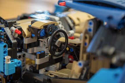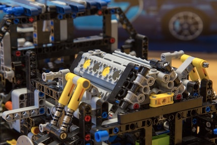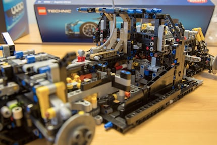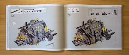 Detaillierte Anleitung, wie es LEGO immer macht.Der falsche W16-Motor im eingebauten Zustand.Die zweite Schachtel beinhaltet wiederum drei Plastiksäcke, in welchen die LEGO-Teile chronologisch nach dem Bauprozess geordnet sind. In diesem Schritt der Bauphase baue ich die vordere Radaufhängung und die Lenkung. Danach kann ich mir den von der ersten Schachtel gebauten Teil nehmen und beide miteinander verheiraten. Jetzt sehe ich zum ersten Mal, wie gross das Ding überhaupt wird. Es ist enorm und wiegt bereits jetzt schon eine halbe Tonne.