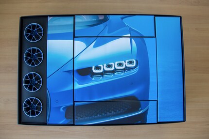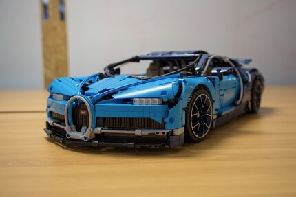 Der fertige Bugatti Chiron in der Frontansicht.Für den gesamten Zusammenbau vom ersten Schritt bis zur letzten Seite des zweiten Buches habe ich knapp 15 Stunden gebraucht. Mit Hochs und Tiefs. Der Spannungsbogen geht zu Beginn stark nach oben und fällt danach von Schachtel zu Schachtel weiter nach unten. Das erste Buch war interessant und die Bauschritte hatten viel mit anderen Technic-Modellen gleich. Die zweite Hälfte war jedoch weniger spannend und zog sich zeitlich in die Länge.