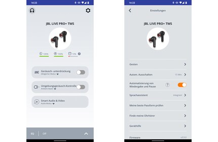 Da hat sich JBL etwas Schönes ausgedacht: Die Live Pro+ haben nicht nur eine aktive, sondern eine adaptive Geräuschunterdrückung. Diese soll nicht nur aktiv gegen störende Geräusche vorgehen, sondern sich auch automatisch an die Umgebungsgeräusche anpassen und je nach Einstellung auch Ton durchlassen – etwa bei einer Unterhaltung.