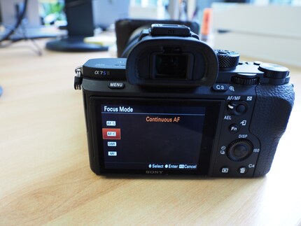 Um zu verdeutlichen, dass sich jeder Hersteller etwas eigenes einfallen lässt, hier das Beispiel der Sony Alpha 7S II: Da gibt es am Objektiv den Ein-Aus-Schalter (Fall 1), zusätzlich aber auch einen Schalter an der Kamera, der zwischen AEL und AF/MF umschaltet (siehe vorheriges oder nächstes Bild). Wenn dieser Schalter auf AF/MF gestellt ist, dann fokussiert man manuell, während die Taste gedrückt gehalten wird.