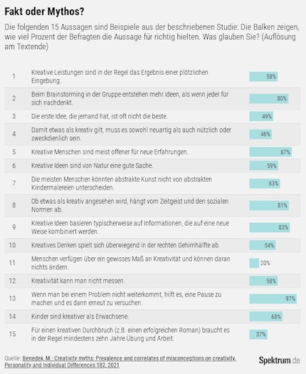 Mit den Fakten taten sich die Befragten weniger schwer: Hier erkannten beispielsweise 97 Prozent richtig, dass eine Pause hilft, auf neue Ideen zu kommen. Aber auch nur rund jeder Zweite wusste, dass die erste Idee oft nicht die beste ist und dass kreativen Höchstleistungen typischerweise zehn Jahre Arbeit vorausgehen.