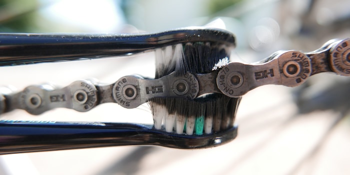 Ich nutze Kettenreiniger, um den Schmutz aufzuweichen. Verklebten Dreck zwischen den Ritzeln entferne ich mit einem Inbusschlüssel oder Schraubenzieher. Für die Feinarbeit habe ich mir aus zwei alten Aufsätzen meiner Elektrozahnbürste und einer Zange ein Spezialwerkzeug gebastelt. Du kannst natürlich auch ein paar Handzahnbürsten zusammentapen und die Kette durchlaufen lassen. Ist der Schmutz entfernt, wird die Kette mit Wasser abgespült und mit einem fusselfreien Tuch getrocknet.