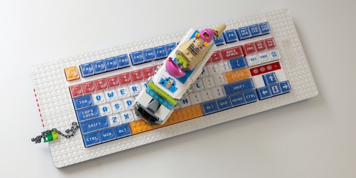 Als sie dann endlich da ist, habe ich noch immer keinen Plan. Ich habe bereits mehrere Verlosungen hier bei Digitec Galaxus durchgeführt – aber einfach nur einen Teilnehmen-Knopf nach einem Review hin zu klatschen finde ich billig. Sowieso habe ich wenig Lust, ein Review zu dem Teil zu machen. Die Tastatur erhält ihren Charakter vor allem durch die Klemmbausteine. Ich will deshalb etwas Kreatives machen.