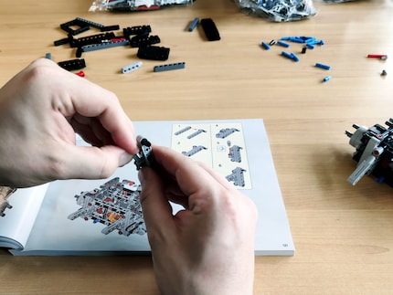 Das Technic-Set hat zwar nicht so viele Einzelteile wie der Liebherr-Bagger, doch mit 2110 Elementen trotzdem eine ordentliche Grösse. Verteilt auf sechs Bauschritte führt dich die Anleitung in gewohnter Lego-Manier durch den Bauprozess.