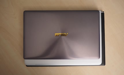 Das markante Scharnier verleiht dem Notebook einen besonderen Look.Das Display ist praktisch randlos, was für einen angenehm kleinen Grundriss sorgt. Einzig der etwa zwei Zentimeter breite schwarze Balken zwischen Display und Tastatur ist ein kleiner Schönheitsmakel.