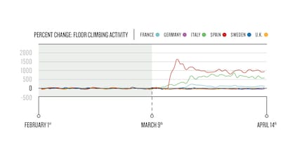 Dabei sei wichtig zu beachten, dass sich das Treppensteigen von der Aktivität auf dem Stepper unterscheide, die zuvor in den Ergebnissen der Fitnessaktivität behandelt wurde. Hier bezieht sich Garmin auf Menschen, die in ihren Wohnungen oder Häusern Treppen rauf- und runtersteigen. In Frankreich habe diese Aktivität um 103 Prozent zugenommen, in Italien sei sie um 572 Prozent in die Höhe geschnellt. Und in Spanien habe das Treppensteigen um erstaunliche 900 Prozent zugenommen.
