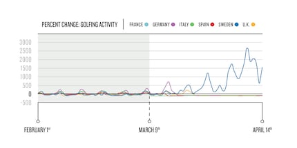 Wenn du Golf spielen möchtest, solltest du nach Schweden gehen. Tatsächlich ist die schwedische Post-Winter-Migration auf die Golfplätze derzeit sogar noch stärker als 2019. Das nordeuropäische Königreich befindet sich inmitten eines aussergewöhnlichen Anstiegs der Golfaktivitäten um 741 Prozent. Diese Zahl sei noch bemerkenswerter, wenn man den Rückgang um 26 Prozent im Vereinigten Königreich betrachte – einem Ort, an dem die Popularität des Sports hoch sei, wo aber die British Open (geplant für Juni) vor kurzem abgesagt wurden.