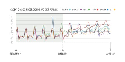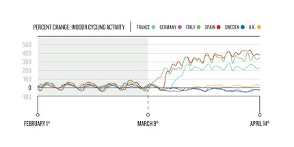 Das oben dargestellte hypothetische Szenario scheint die überraschende Realität in Frankreich, Italien und Spanien zu sein, wo strenge Richtlinien für das Zuhause bleiben gelten. Vergleicht man die Phasen vor und nach der Ausgangssperre in Frankreich, so stellt Garmin einen bemerkenswerten Anstieg der Aktivitäten um 157 Prozent fest. Spanien und Italien melden mit 273 Prozent beziehungsweise 309 Prozent ebenfalls Rekordhöhen beim Indoor-Cycling. Das Ausmass dieser Verschiebung sollte nicht unterschätzt werden – man erlebe einen historisch steilen Anstieg bei einer Aktivität, die typischerweise im Frühjahr abnimmt. Das habe es noch nie zuvor gegeben.