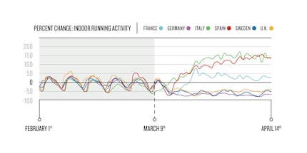 Werfe man einen tieferen Blick in die Daten, zeige sich, dass Nutzer in den Ländern mit den strengsten Kontaktbeschränkungen aufs Laufband umsteigen würden, in vielen Fällen auch virtuell. Italiener, Spanier und Franzosen laden rekordverdächtig viele Laufaktivitäten hoch, wobei die jeweiligen Länder Zuwächse von 130, 84 und 18 Prozent verzeichneten.