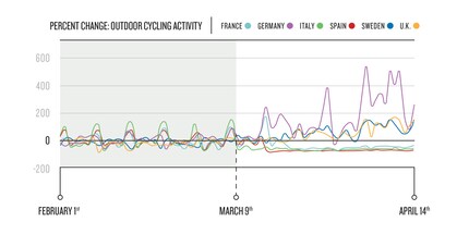 Schaue man sich den Radsport in Deutschland, Grossbritannien und Schweden an, zeige die Trendlinie eine deutliche Verlagerung nach Draussen. Allein in Deutschland verzeichnet Garmin einen Anstieg des Outdoor-Radsports um 153 Prozent. Im gleichen Zeitraum, im Jahr 2019, gab es in Deutschland nur einen Anstieg von 36 Prozent. Es sei gut möglich, dass hier psychologische Faktoren wie der Wunsch nach mehr Aktivität im Angesicht von Widrigkeiten, eine Rolle spielen könnten. Zudem zeige diese Trendlinie auch, wie gut die Ausgangsbeschränkungen in Frankreich, Italien und Spanien eingehalten würden.