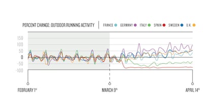 Laufen ist gemäss Garmin die beliebteste und am meisten geteilte Frühlingsaktivität. In Spanien und Italien, wo die landesweiten Sperren am extremsten sind, hat das Laufen im Freien mit einem Rückgang von 68 respektive 42 Prozent deutlich abgenommen.