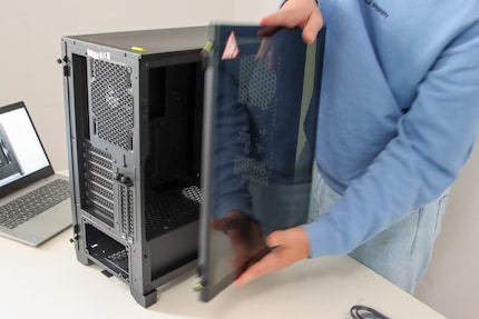 Als Nächstes öffnet Max das Gehäuse. Die Schrauben, welche die Seitenteile halten, sind fest verbaut und lassen sich bequem mit den Fingern lösen. Für SSDs sind zwei Käfige an der Seite des Gehäuses vorhanden. Alternativ könnte er sie auch im Innenbereich festschrauben. Allerdings dauert es etwas, bis er die Funktionsweise der Käfige, die eigentlich Halterungen sind, versteht.